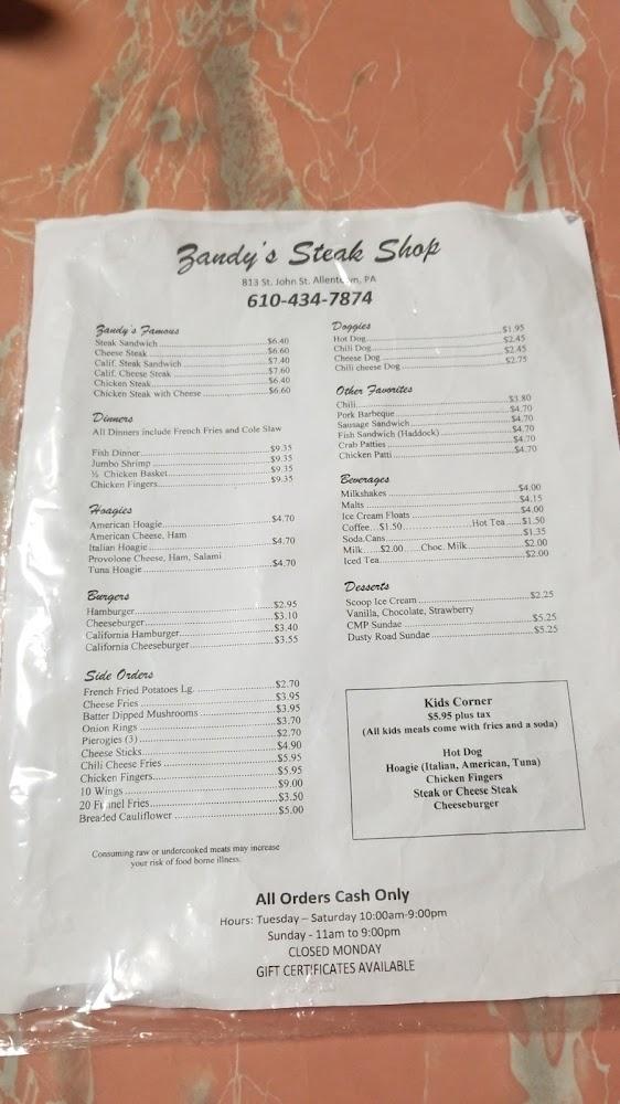 Welcome to Zandy's Steak Shop, your go-to destination in Allentown for authentic Philadelphia cheesesteaks and hoagies! Located at 813 St John St, our casual eatery offers a cozy atmosphere perfect for solo lunches or group dinners. Enjoy our quick service and delectable menu featuring local specialties, all at affordable prices ranging from $10 to $20. With options for takeout, dine-in, and delivery, we cater to every need. Families are welcome, with high chairs and a kids' menu available. Experience the best of American grill-style cuisine in a historic setting. Come savor the flavors of Zandy’s today!